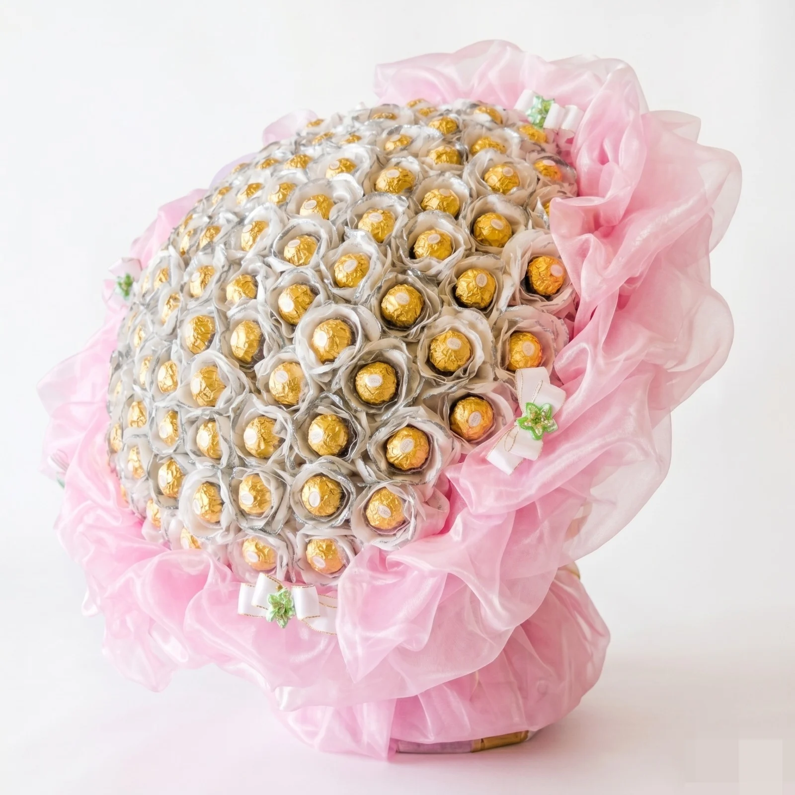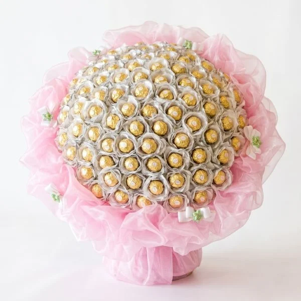Go big with a gift that truly amazes. This spectacular 99pcs Ferrero Rocher Chocolate Bouquet is lavishly arranged into a grand round bouquet finished in elegant pink wrapping. Impressive in size and irresistible in taste, it is made for unforgettable moments and major celebrations.