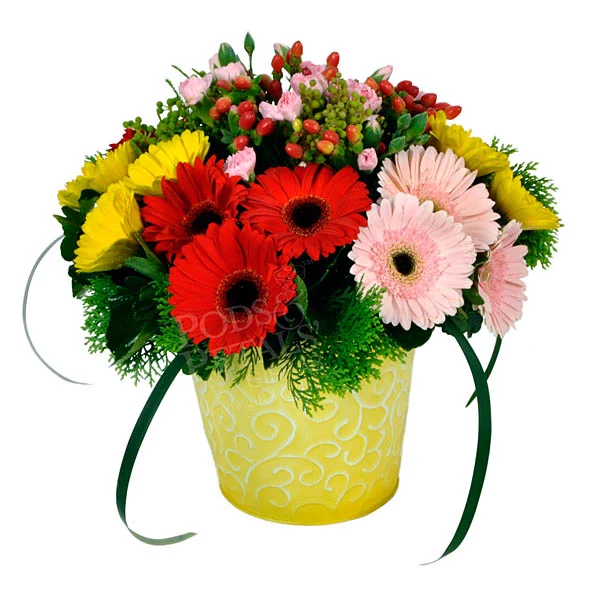Brighten someone’s day with this cheerful gerbera flower pot arrangement, bursting with vibrant red, yellow and soft pink gerberas, accented with seasonal fillers and greenery. Presented in a classic metal pot, this joyful floral gift is perfect for birthdays, thank you gestures, housewarmings, congratulations or simply to make someone smile.