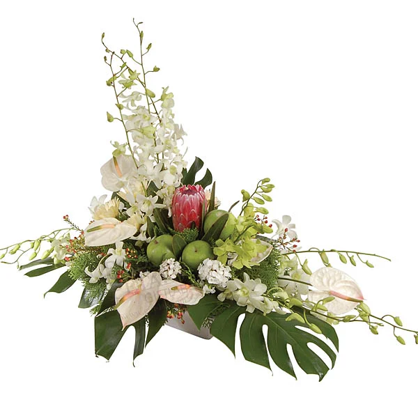 A comforting wreath arrangement of Orchids, Protea, Green Apple, Monsteras and Anthuriums to soothe and console.